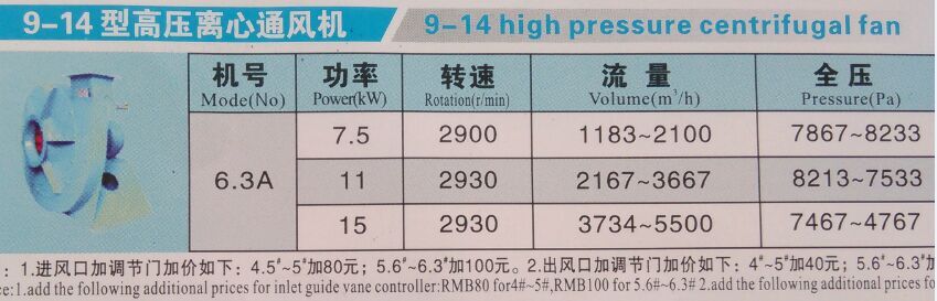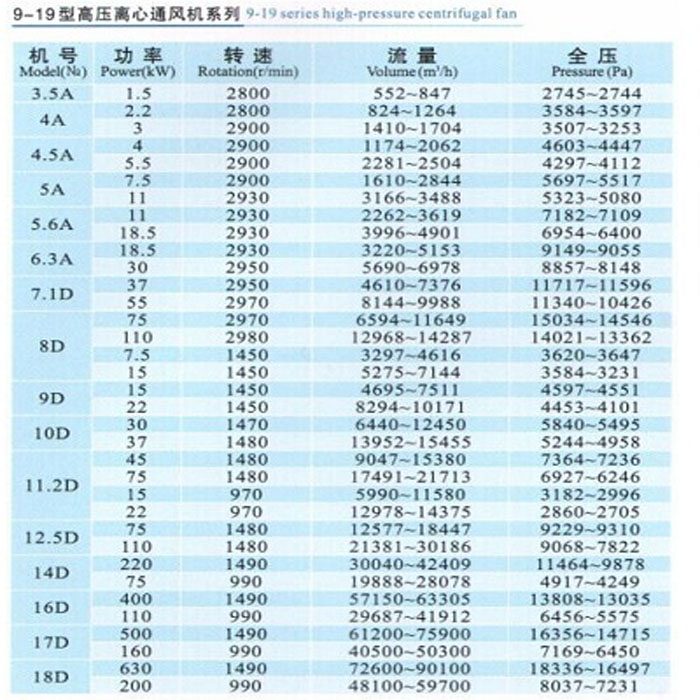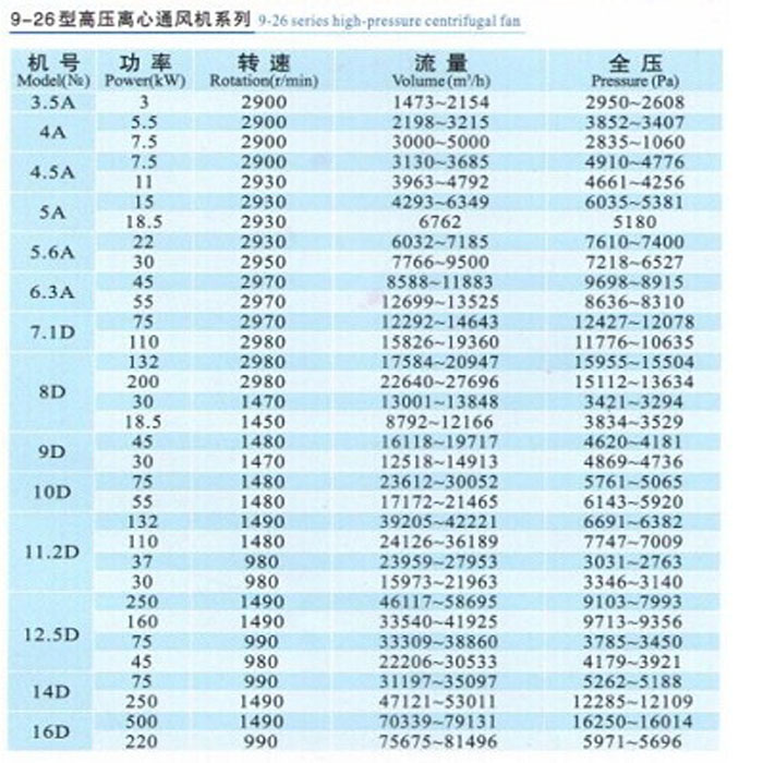 目前市場(chǎng)上常用的五款高壓離心通風機,有9-19高壓離心通風機(jī)、9-26高壓離心通風機、9-14高壓離心通風機、XQ型高壓離心通(tōng)風機、8-09型高(gāo)壓離心通風機、9-12型高壓離心通(tōng)風機。廣泛應用於鍛冶爐、玻璃、電鍍、陶(táo)瓷、畜電池、無線電等行業高壓強製通風,並可(kě)廣泛用於糧食、飼料、礦粉等加工行業的物料輸送,也適合用於紙箱機構設備、鋼化玻(bō)璃設備等配套使用。下麵就這六款高壓離心通風機的詳細參數羅列如下: