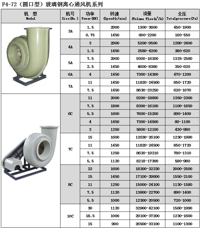 GF4-72(C式)型係列玻璃鋼離心通風機采用(yòng)聚脂玻璃鋼材(cái)質,它具有強度高、重量輕(qīng)、耐腐蝕性能良好、不易老化、噪聲低(dī)等特點,是較理解的新型防腐蝕風機,葉輪采用水冷座或油冷座經(jīng)角帶與電機傳動。其好處是減少(shǎo)腐蝕電機、減速、降低電機負荷等作用,從而增加風機(jī)使用壽命。
