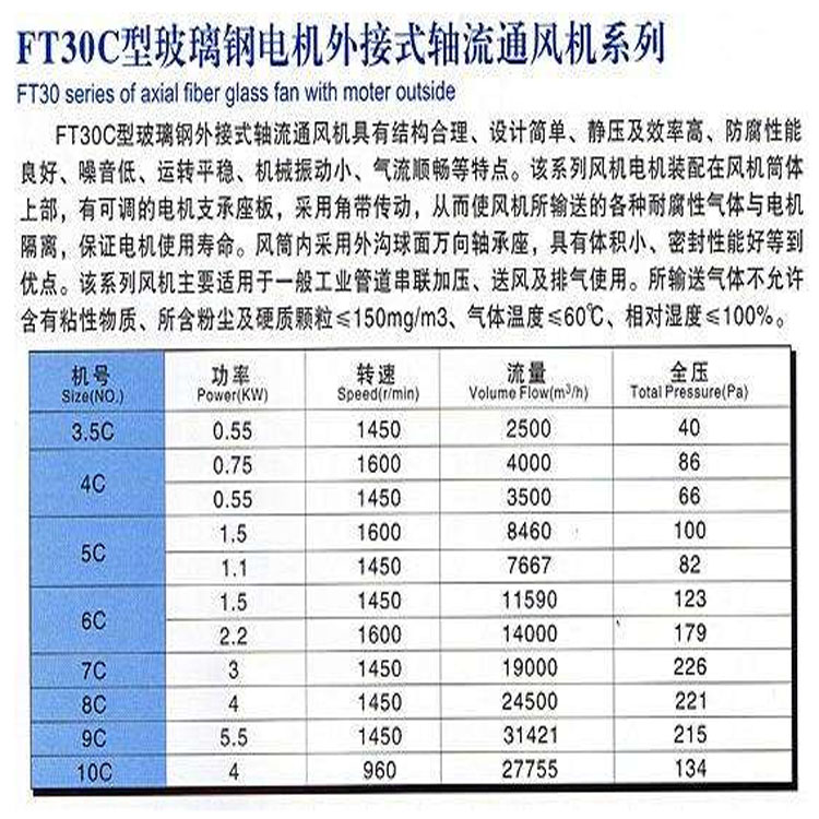 FT30軸(zhóu)流式玻璃鋼防腐風機(jī)。該風機具有結構合理、設計(jì)簡單、靜壓及(jí)效率高、防腐性(xìng)能良好、噪音低、運(yùn)轉平穩(wěn)、機械振動小、氣流(liú)順暢等特點(diǎn)。主要適用於一般工業管道串聯(lián)加壓、送風及排氣(qì)使用。